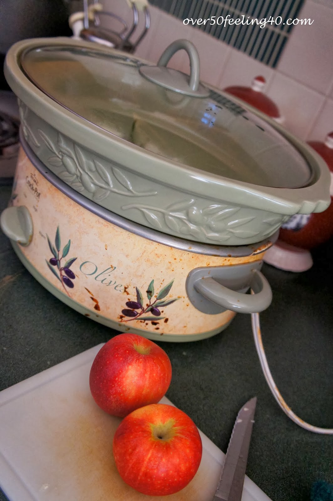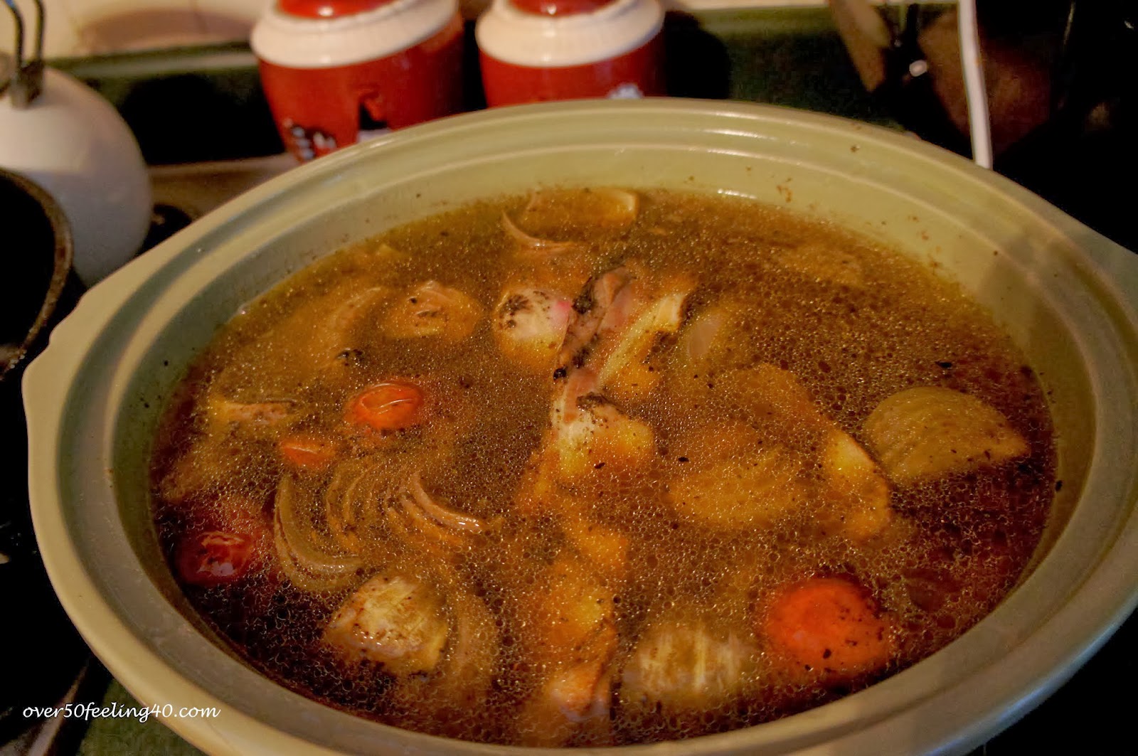 Well, today at Midlife Boulevard, the ladies are sharing their chili recipes. I used to make chili a lot when the whole family was at home...but I haven't made it in awhile. So, I am going to show you how to make a turkey and dressing soup! You start with a crockpot and fill with water, three slices of Applewood Bacon, three stalks of celery, one large sweet yellow onion (cut up), three cloves of garlic, fresh sprig of rosemary and three large turkey legs.