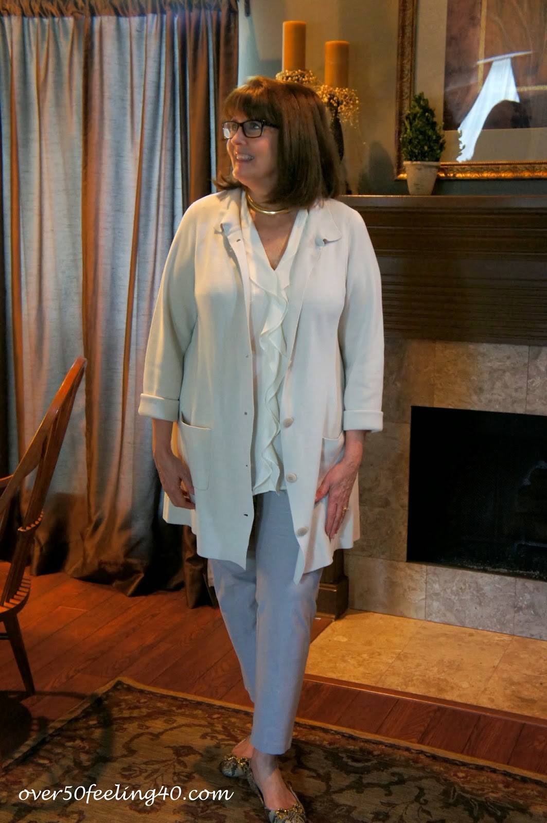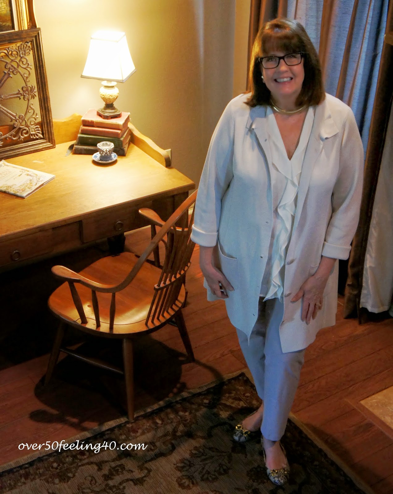 I guess it is okay to give myself a treat...right? I fell in love with this EILEEEN FISHER BONE SILK AND COTTON JACKET when I first saw it....so, when the sale price hit, I gave in! The EF CREPE PANTS were purchased last summer in Chicago at the Eileen Fisher location in WATER TOWER PLACE!