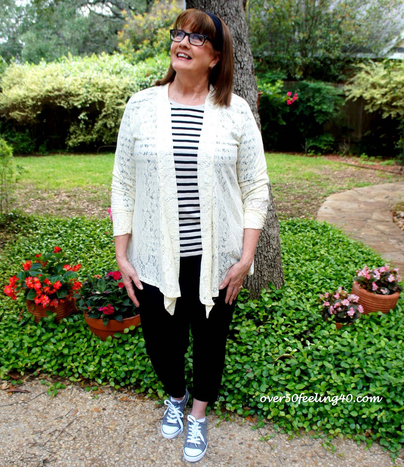 Finally, the reason I styled this outfit with the lace cardigan is the shirt actually includes touches lace in the design. The lace on each side is slimming as well. You can see the sale price HERE is very reasonable!