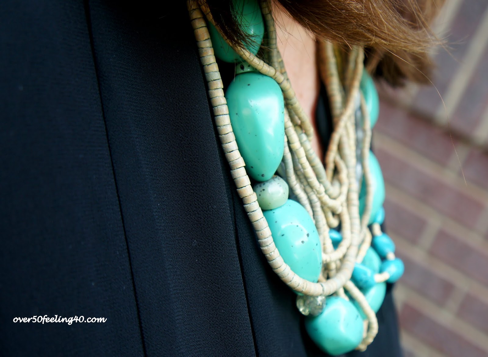 That is when you say the season with accessories. Here is an outfit I have worn here before, but just accessorized differently with a summer necklace and sandals. This summer I have seen more and more women wearing black looks, and I was encouraged since my style is now heavy into blacks, browns, grays, and whites. For the most part, I avoid pastels and wear more saturated colors.