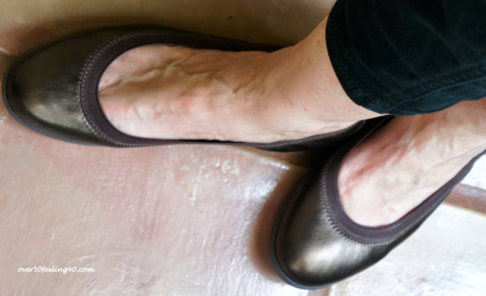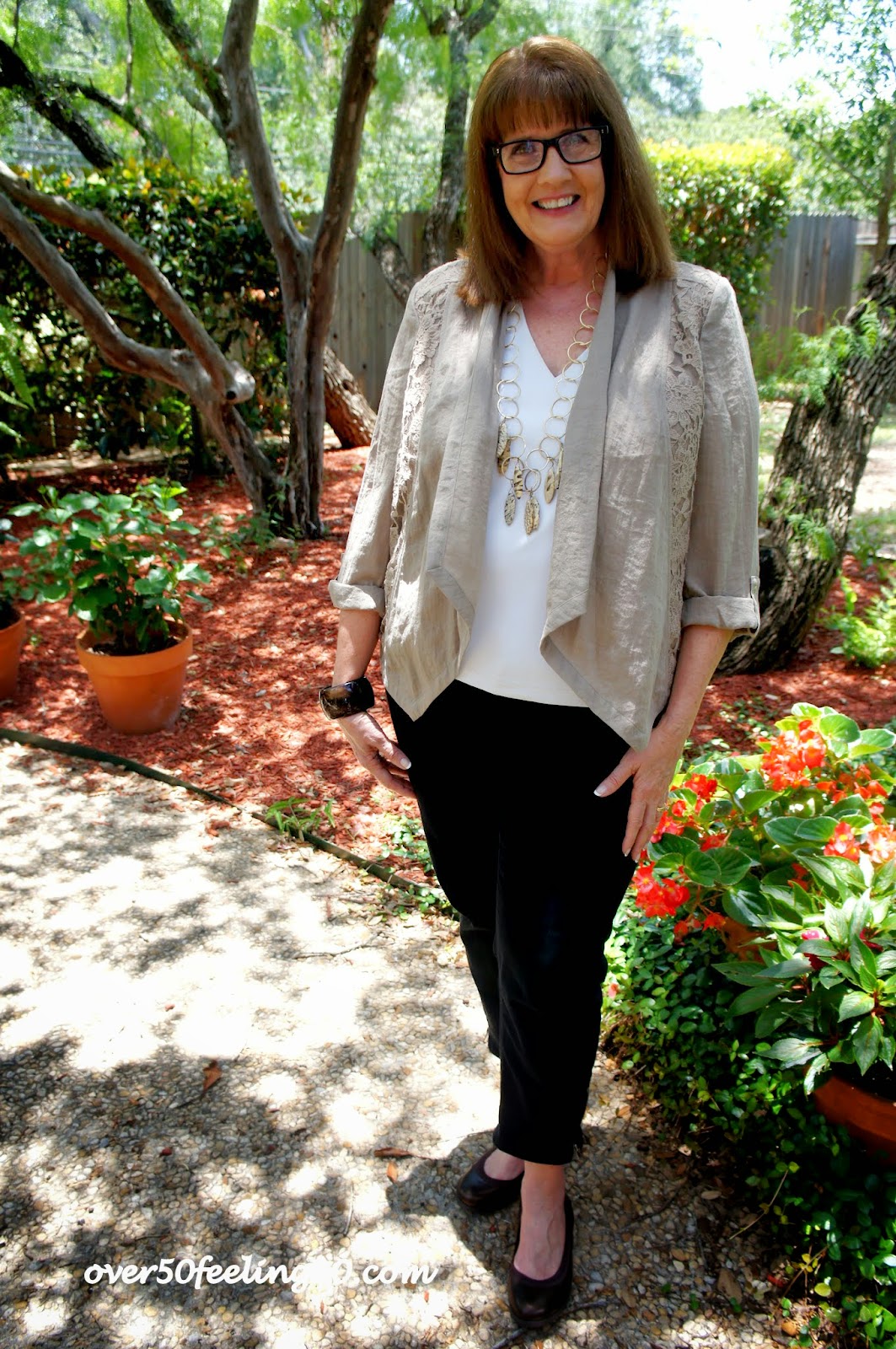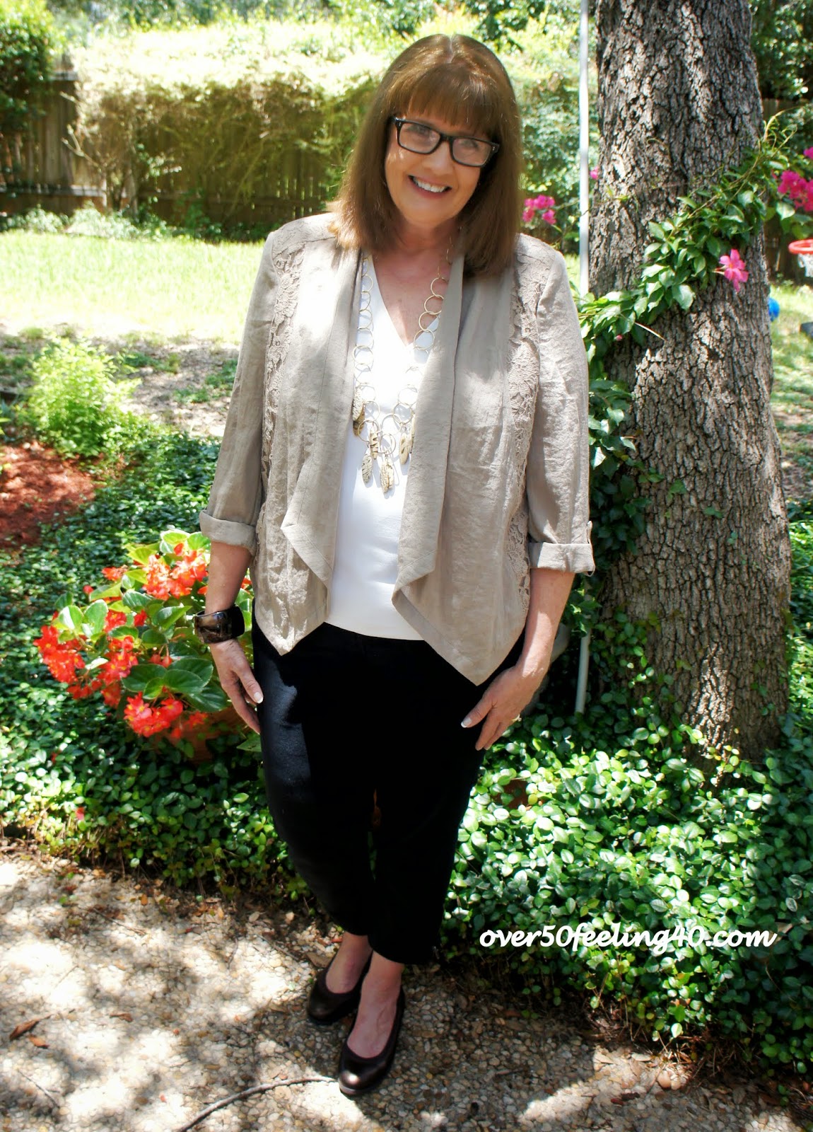 Today, I am wearing a jacket recently purchased at CHICO'S...I like the way it has a touch of lace on the sides. This is how I prefer to do lace. Both this jacket and my new flats are great examples of why we need to try things on and spend time in the dressing room. The jacket is a size smaller than I usually wear at Chico's and the shoes are a whole size larger...I actually grabbed them without checking the size, and they fit!! They are COLE HAAN, leather, bronze flats from DILLARDS...$40!